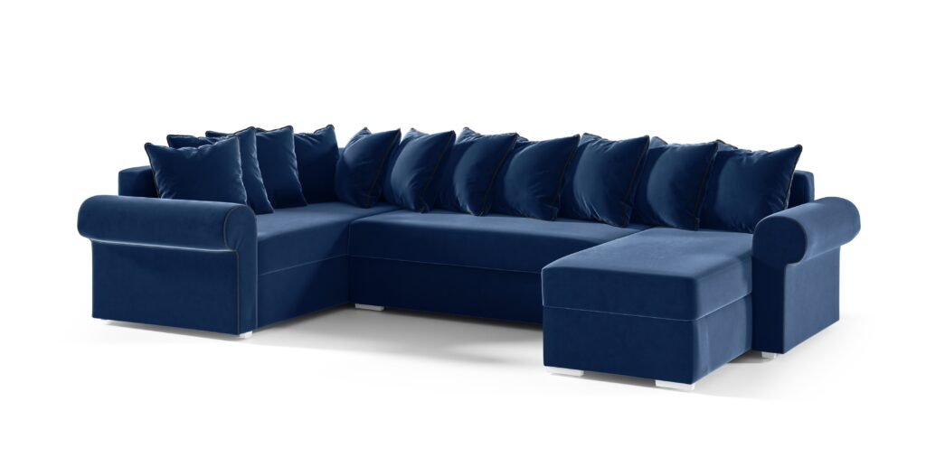 Jeśli dysponujesz przestronnym salonem, narożnik w kształcie U to doskonały wybór. Taki mebel nie tylko zapewni mnóstwo miejsca do siedzenia dla całej rodziny i gości, ale również pozwoli wizualnie uporządkować dużą przestrzeń. Granatowy kolor sprawi, że tak duży mebel nabierze lekkości i elegancji.