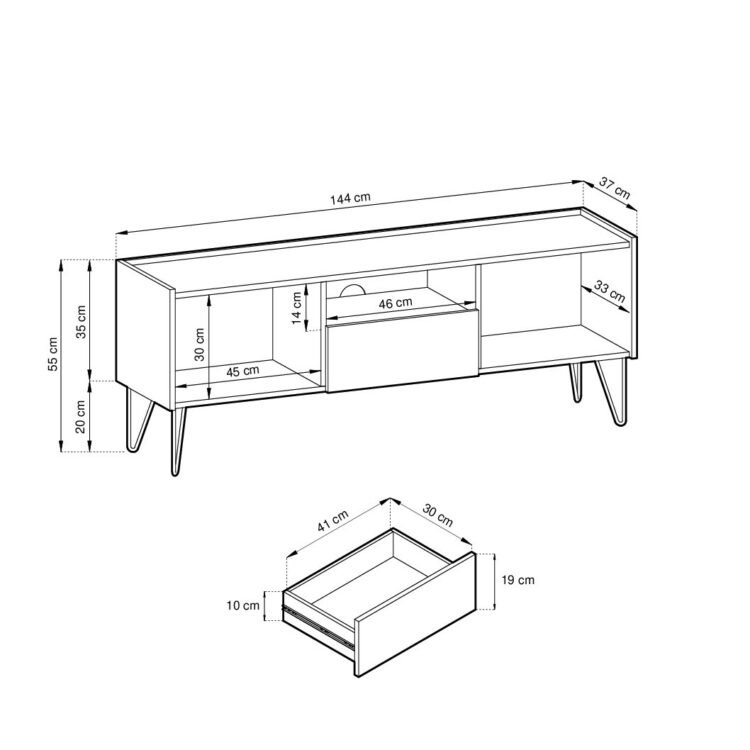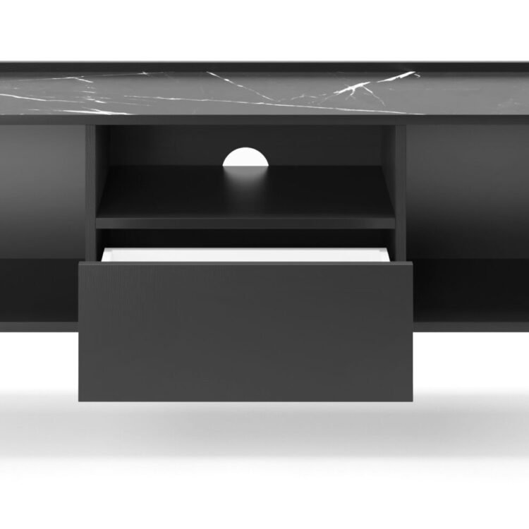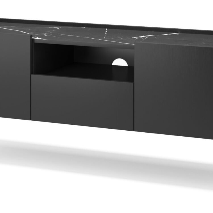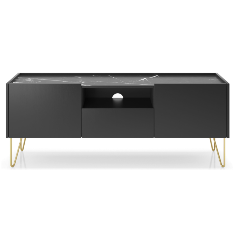 Dzięki czarnemu korpusowi o strukturze naturalnego drewna oraz blatowi z marmuru Black Royal, szafka nie tylko wyróżnia się elegancją, ale również doskonale komponuje się z nowoczesnymi wnętrzami. Bezuchwytowe fronty podkreślają jej nowoczesny charakter. Złote, metalowe nóżki dodają lekkości całej konstrukcji. Co więcej, szafka EBORIA RTV 144 oferuje praktyczne rozwiązania, takie jak dwie zamknięte szafki, szuflada i otwarta półka, aby ułatwia organizację sprzętu.