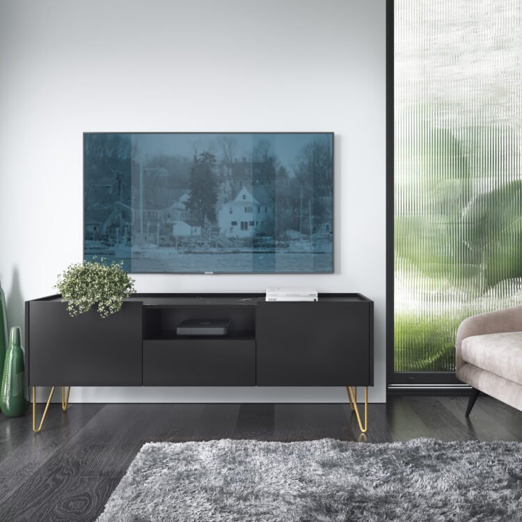 EBORIA RTV 144 to nowoczesny i elegancki mebel, który stanie się ozdobą każdego salonu. Jej złote nóżki i stylowy design dodają wnętrzu luksusu i nowoczesności. Szafka łączy estetykę z funkcjonalnością, oferując miejsce do przechowywania sprzętu multimedialnego oraz dekoracji.