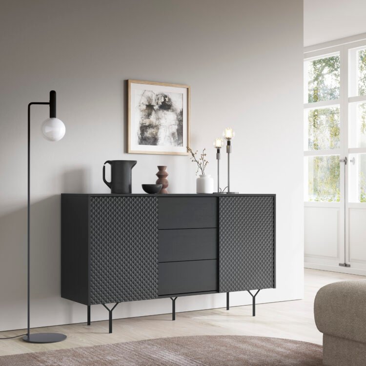 - Nowoczesny design: Frezowane fronty wykonane w technologii 3D dodają komodzie unikalnego charakteru, a także elegancji.