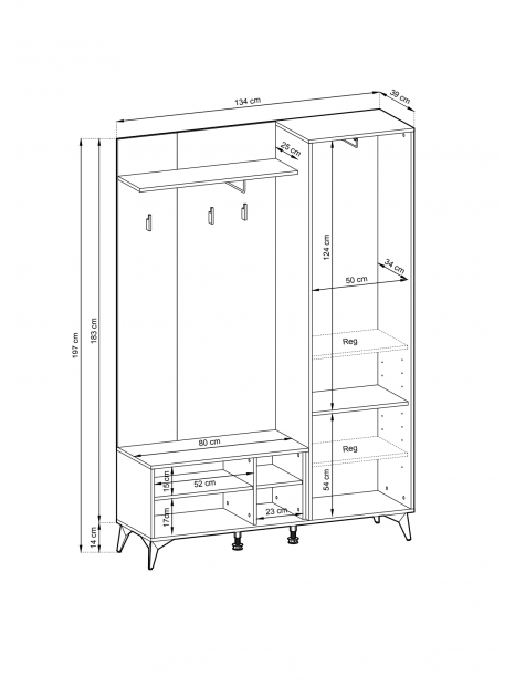 • Wysokość: 197 cm (z nóżkami)