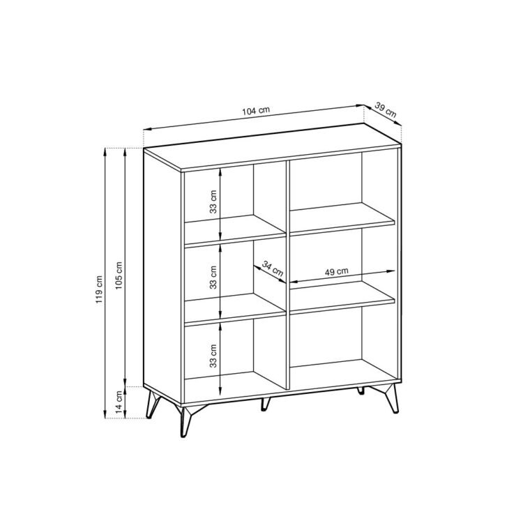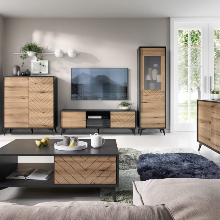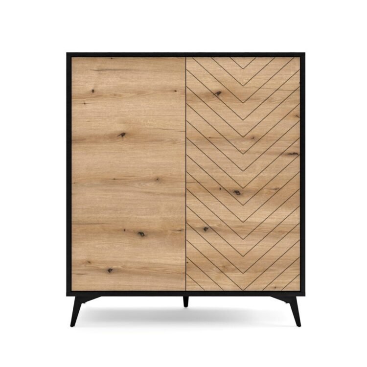- Stylowy design: Frezowany front w kształcie jodełki oraz metalowe czarne nóżki nadają komodzie nowoczesny, a także elegancki charakter.