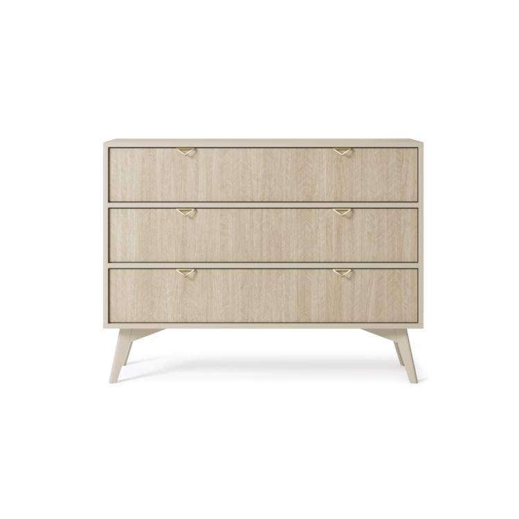 Beżowe wybarwienie korpusu wprowadza do pomieszczenia nutę ciepła, a także przytulności, zaś fronty zdobione modnym wzorem jodełki podkreślają niepowtarzalny charakter mebla. Całość świetnie dopełniają wysokie drewniane nóżki, które dodają lekkości i stabilności całej konstrukcji.