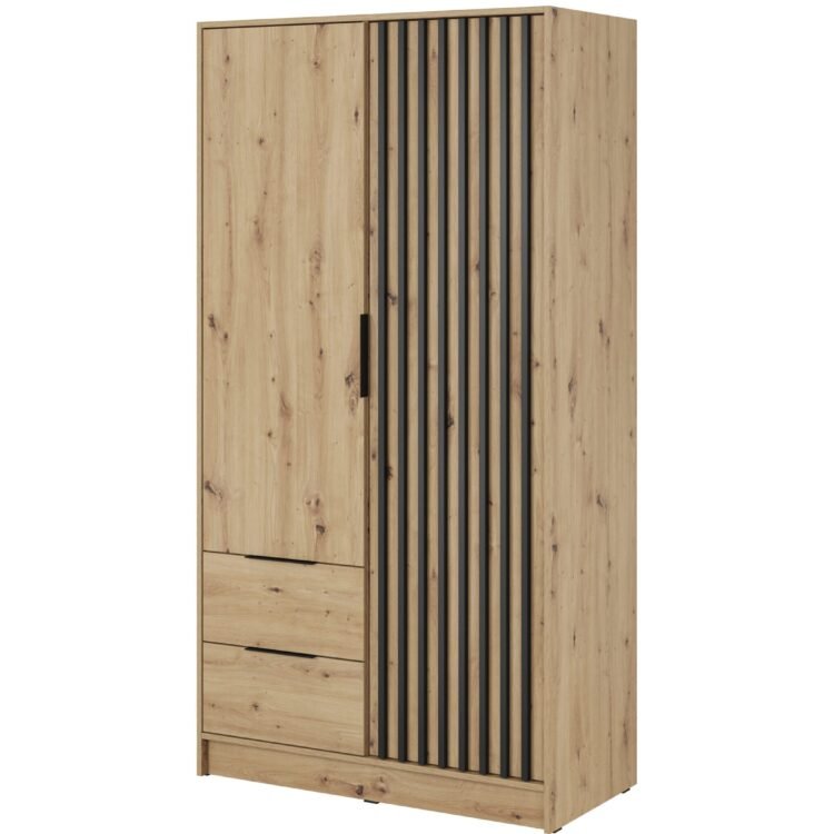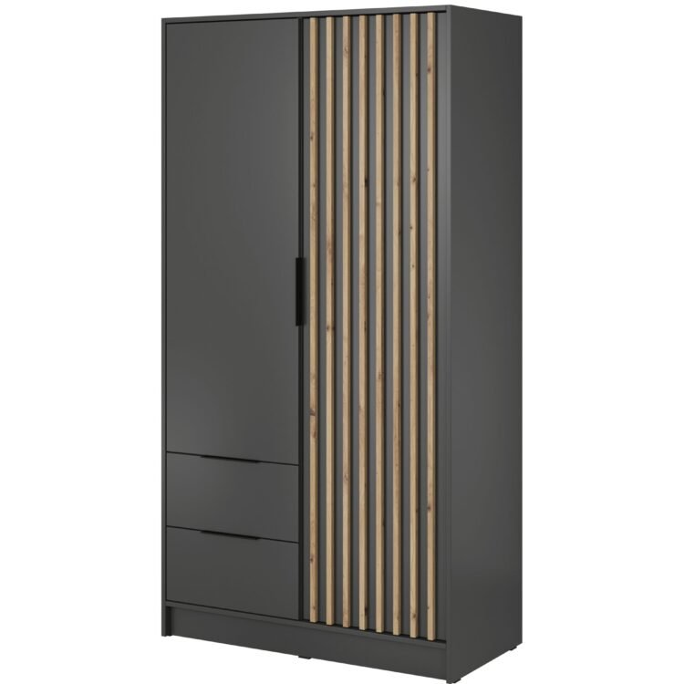 Szafa Nelly 2D to doskonałe połączenie nowoczesnego designu i funkcjonalności. Dzięki przemyślanemu układowi wnętrza, z łatwością uporządkujesz swoje ubrania, a eleganckie lamelki w połączeniu z nowoczesnym wykończeniem dodadzą stylu każdemu wnętrzu.
