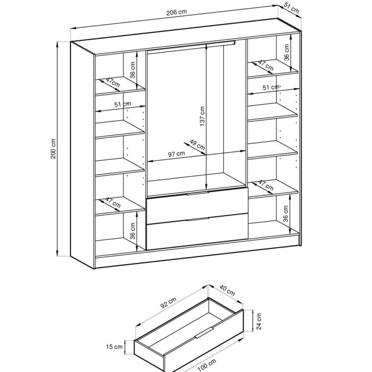 Wnętrze szafy zostało zaprojektowane z myślą o funkcjonalności: regulowane półki, drążek na wiszące ubrania oraz pojemne szuflady, aby zapewnić doskonałą organizację przestrzeni. Uchwyty w kolorze czarnym, wykonane z tworzywa sztucznego, aby dodać subtelny akcent, który uzupełnia nowoczesny charakter mebla.