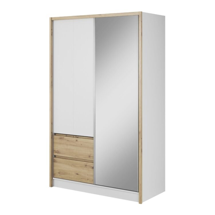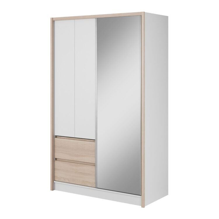 Drzwi szafy zostały pokryte lustrem, aby optycznie powiększyć przestrzeń, a mechanizm przesuwny zapewnia wygodne użytkowanie. Prosta, ale elegancka kolorystyka i konstrukcja szafy sprawiają, że z łatwością dopasujesz ją do innych elementów wystroju.