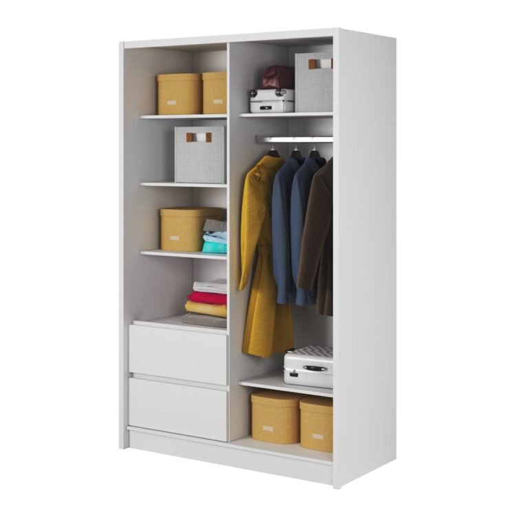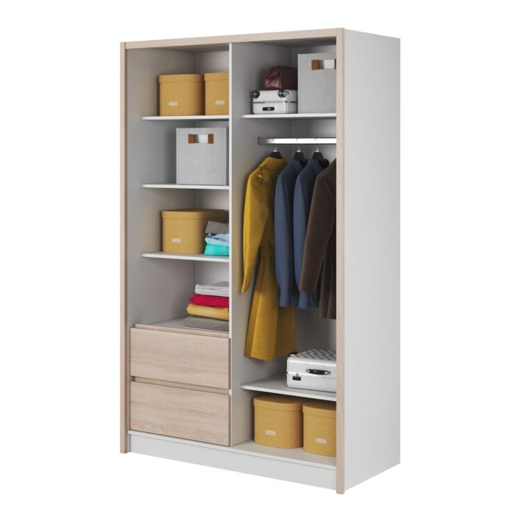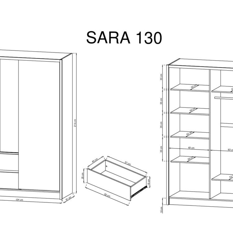 Wewnątrz szafy znajduje się przestronny drążek na ubrania, wiele półek oraz pojemne szuflady, które umożliwiają przechowywanie odzieży, bielizny i innych przedmiotów. Mebel jest wykonany z wysokiej jakości materiałów, takich jak płyta laminowana o grubości 16 mm, okleina ABS oraz listwy z płyty MDF, co zapewnia trwałość i odporność na uszkodzenia mechaniczne oraz wilgoć. Dzięki tym materiałom, szafa PURA 130 jest łatwa w utrzymaniu czystości – wystarczy przetrzeć ją zwilżoną, miękką ściereczką.