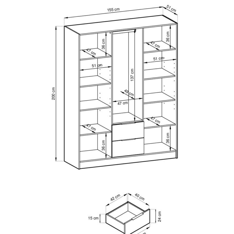 Wnętrze szafy zostało zaprojektowane z myślą o funkcjonalności: regulowane półki, drążek na wiszące ubrania oraz pojemne szuflady, aby zapewnić doskonałą organizację przestrzeni. Uchwyty w kolorze czarnym, wykonane z tworzywa sztucznego, aby dodać subtelny akcent, który uzupełnia nowoczesny charakter mebla.