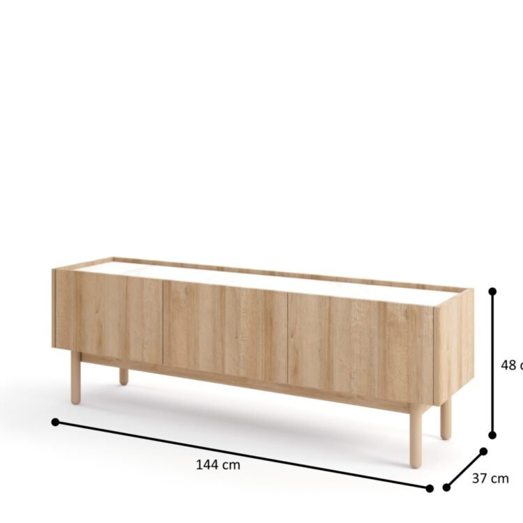 • Przemyślane wymiary – szerokość 144 cm, wysokość 48 cm i głębokość 37 cm zapewniają odpowiednią ilość miejsca na sprzęt RTV, przy jednoczesnej oszczędności miejsca w pomieszczeniu.