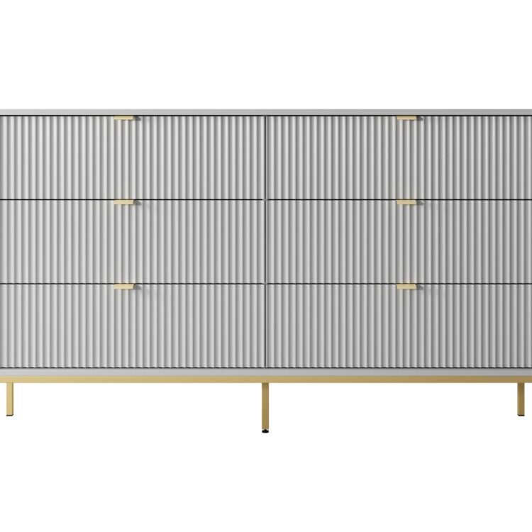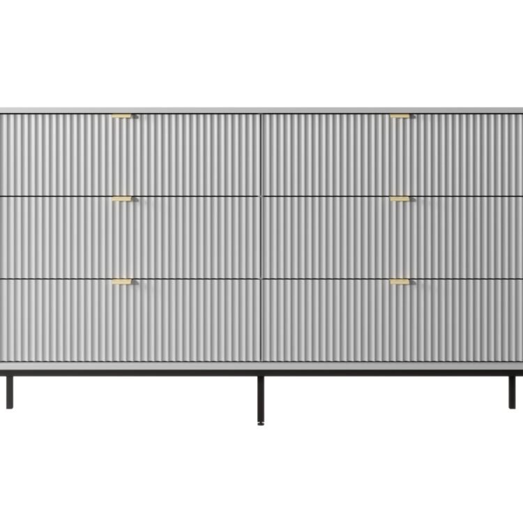 • Nowoczesny design: Prosta konstrukcja na wysokich, metalowych nóżkach podkreśla elegancję mebla, a ryflowany front, a także aluminiowe uchwyty dodają nowoczesnego charakteru.